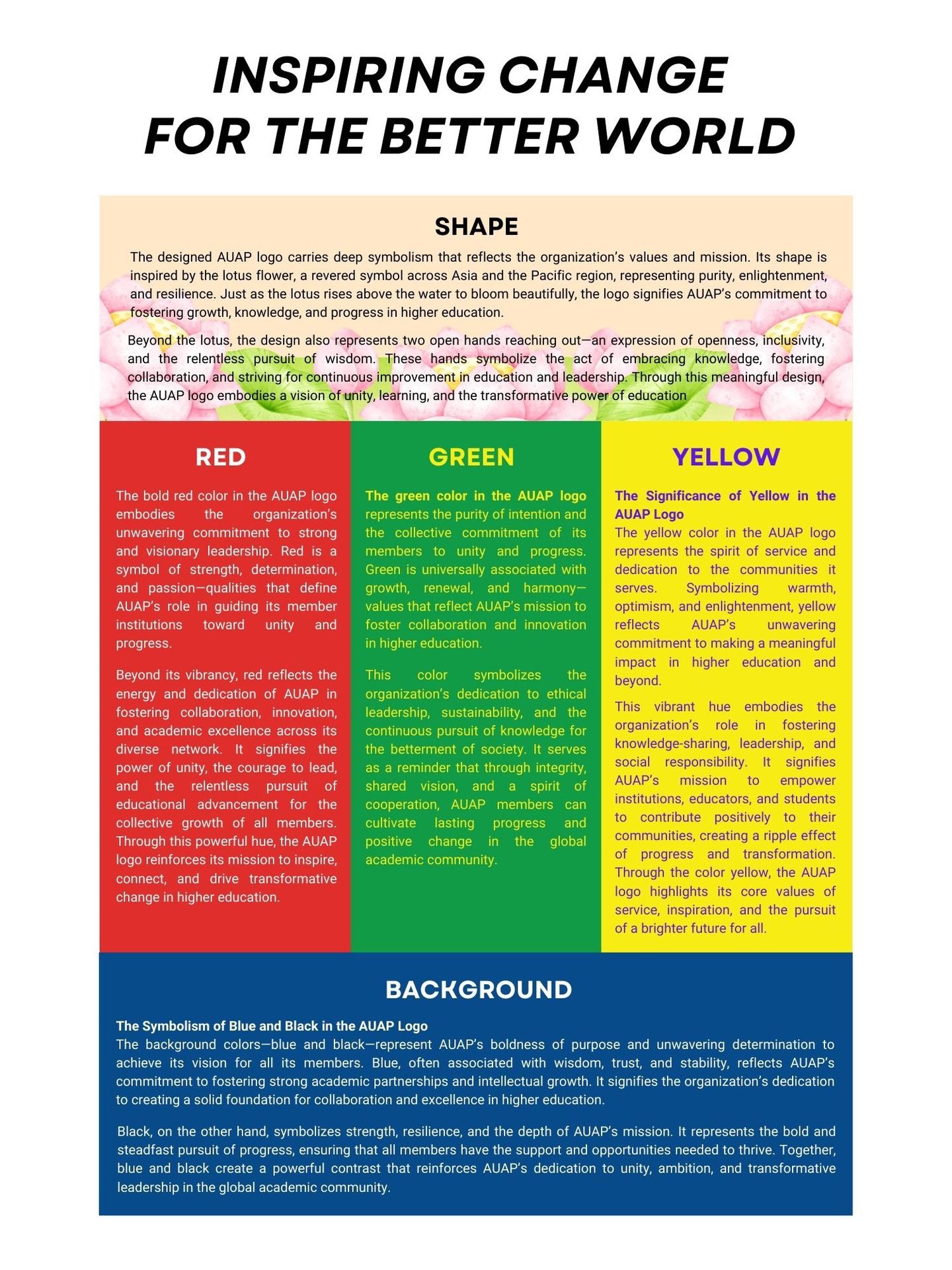 The background colors—blue and black—represent AUAP’s boldness of purpose and unwavering determination to achieve its vision for all its members. Blue, often associated with wisdom, trust, and stability, reflects AUAP’s commitment to fostering strong academic partnerships and intellectual growth. It signifies the organization’s dedication to creating a solid foundation for collaboration and excellence in higher education.