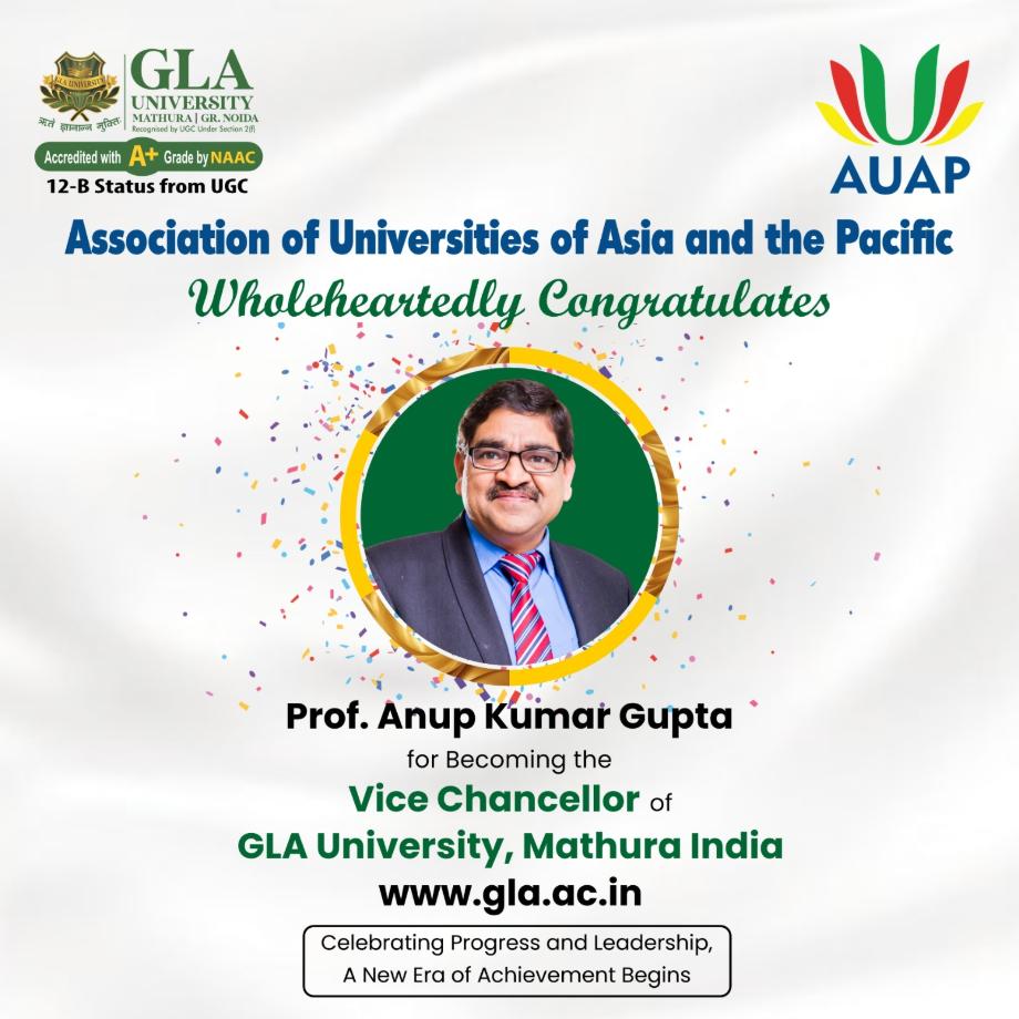 ๐ AUAP Celebrates Excellence in Leadership! ๐Heartiest congratulations to Prof. Anup Kumar Gupta on being appointed as the new Vice-Chancellor of GLA University, Mathura, INDIA, effective 1st January 2025!A visionary leader and an accomplished scholar, Prof. Gupta has been a cornerstone of GLA's journey since its inception in 1998.๐ About Prof. Anup Kumar Gupta:๐ธ Gold Medalist in MA and MPhil in English Literature๐ธ Patron of the GLA University Entrepreneur Cell๐ธ Honorary Advisor of GLAU NewGen IEDC (DST-supported incubation center)๐ธ A dedicated academician who has contributed immensely to GLAโs rise as a premier institution Under his dynamic leadership, we foresee GLA University scaling new heights, achieving significant milestones, and empowering future generations of learners and innovators.At AUAP, we take pride in celebrating the success of our member universities and their leaders who shape the future of education. ๐ก AUAP extends its best wishes to Prof. Gupta and GLA University for continued growth, innovation, and milestones in the years ahead. ๐ก Together, letโs build a legacy of academic brilliance!#AUAP #Leadership #GLA #University #Membership #Higher #Education #Innovation #Entrepreneurship #Vice #Chancellor #Pioneering #Excellence #Global #Education #Milestones #irac