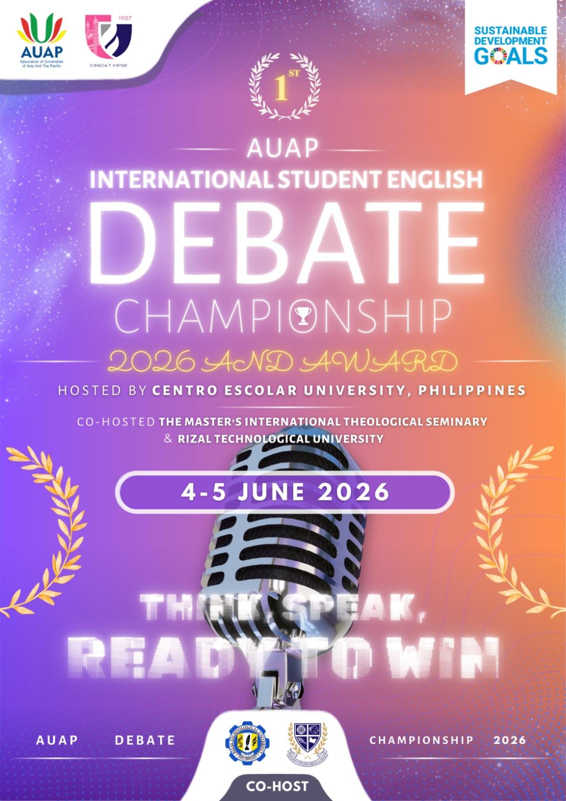 We are delighted to invite your esteemed institution to participate in the 1st AUAP International Student English Debate Championship 2026 and Awards, organized by the Association of Universities of Asia and the Pacific (AUAP) in collaboration with Centro Escolar University, co-hosted by Rizal Technological University and Master's Institute Development Academy and Seminary (MIDAS).