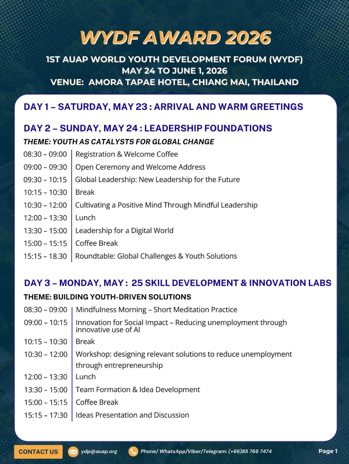 The Association, in collaboration with Ureka Global Innovation Hub, United Kingdom, is pleased to announce the 1st AUAP World Youth Development Forum and Awards 2026 (WYDF), to be held from May 24 to June 1, 2026, in Chiang Mai, Thailand.