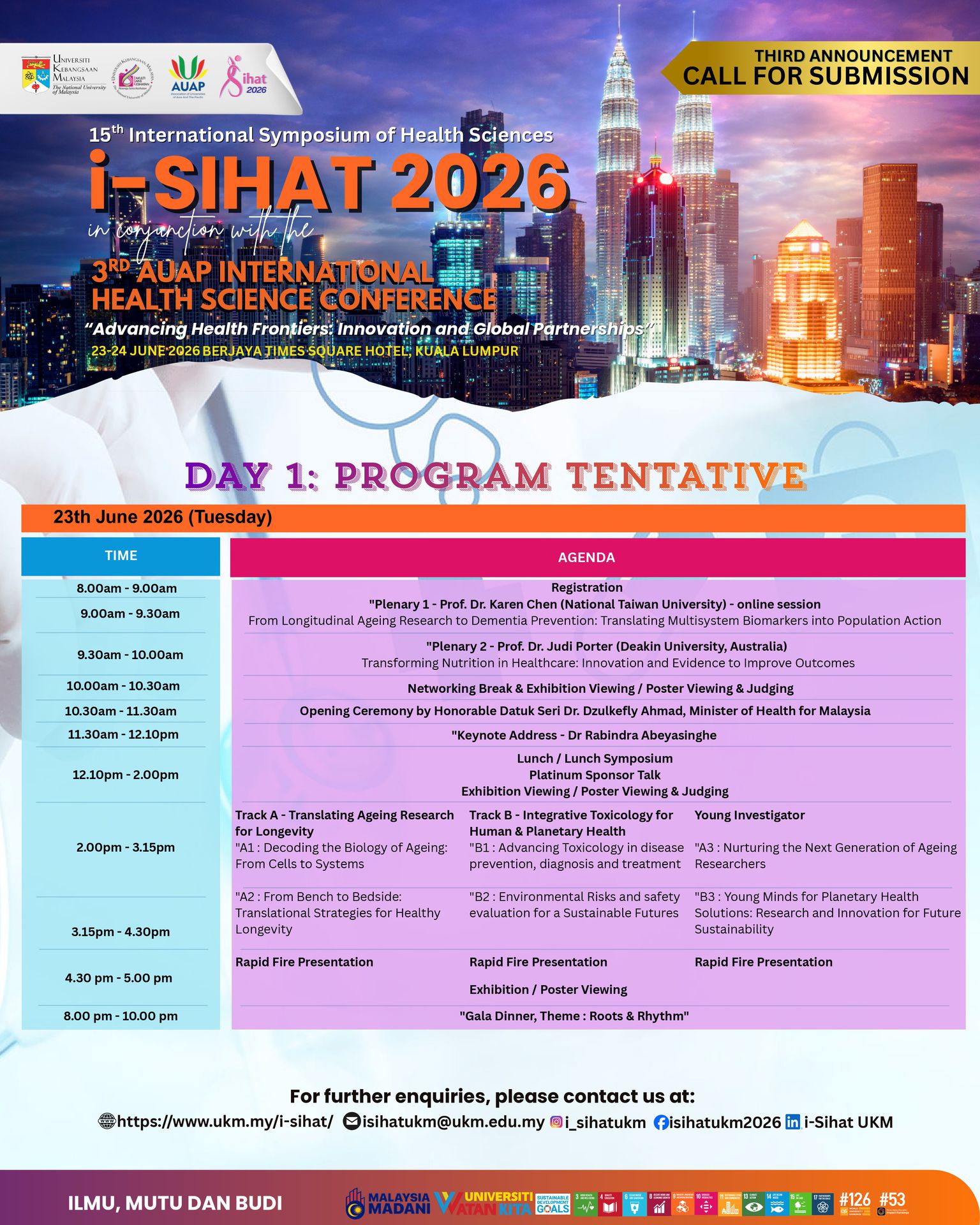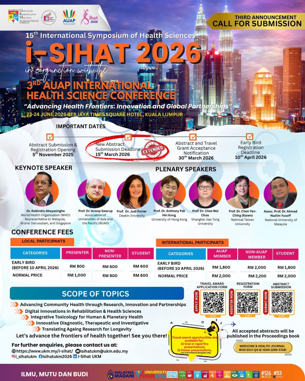 The Association of Universities of Asia and the Pacific (AUAP) in cooperation with Universiti Kebansann, Kuala Lumpur, Malaysia will organize the 3rd AUAP International Health Science Conference 2026! In conjunction with the 15th International Symposium of Health Sciences (i-SIHAT 2026), under the theme: “Advancing Health Frontiers: Innovation and Global Partnerships.”