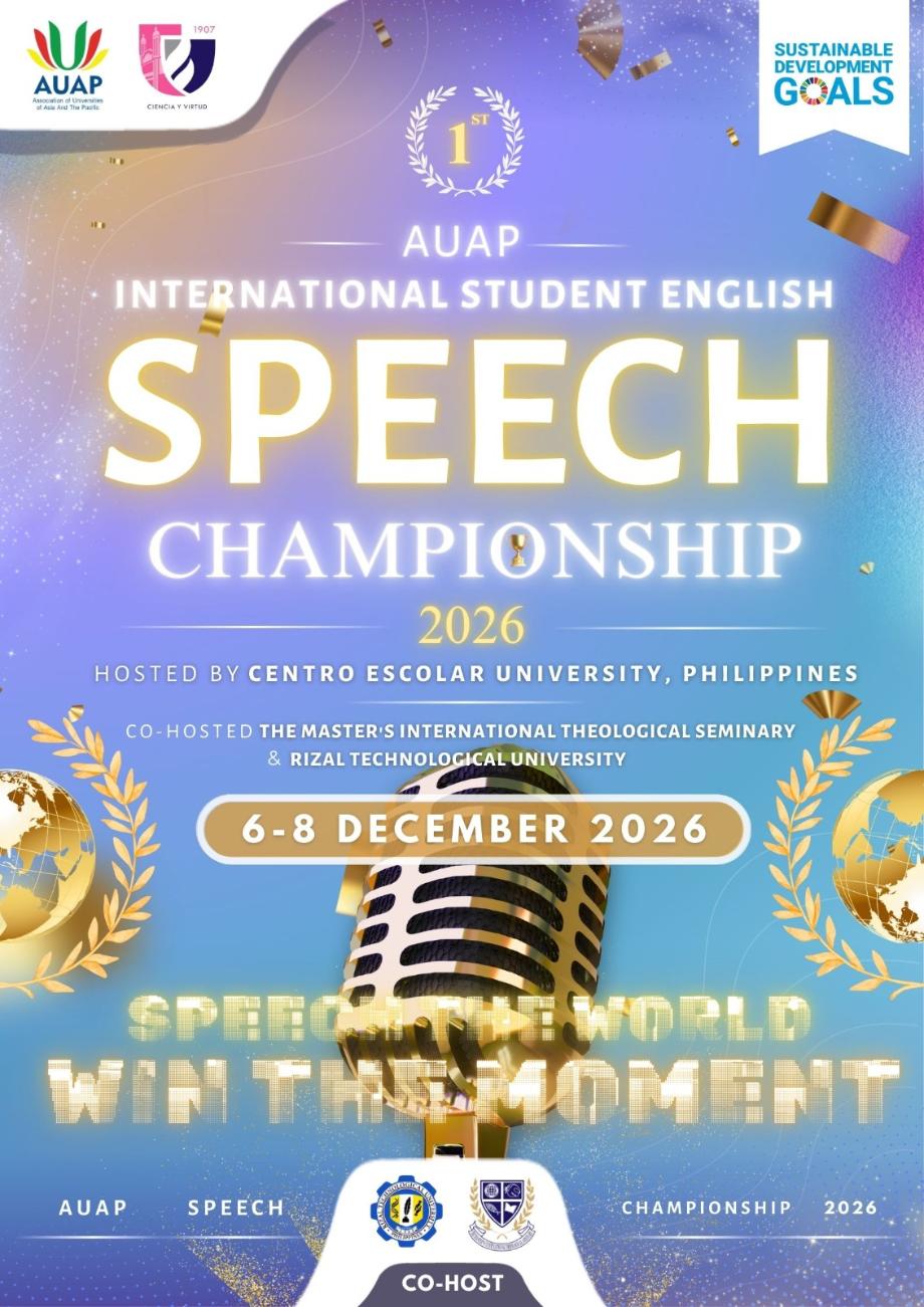 We are delighted to invite your esteemed institution to participate in the upcoming 1st AUAP International Student English Speech Championship 2026 and Awards, organized by the Association of Universities of Asia and the Pacific (AUAP) in collaboration with Centro Escolar University , Manila, Philippines, Co-hosted by Rizal Technological University (RTU) and Master's Institute Development Academy and Seminary (MIDAS), Thailand , Philippines