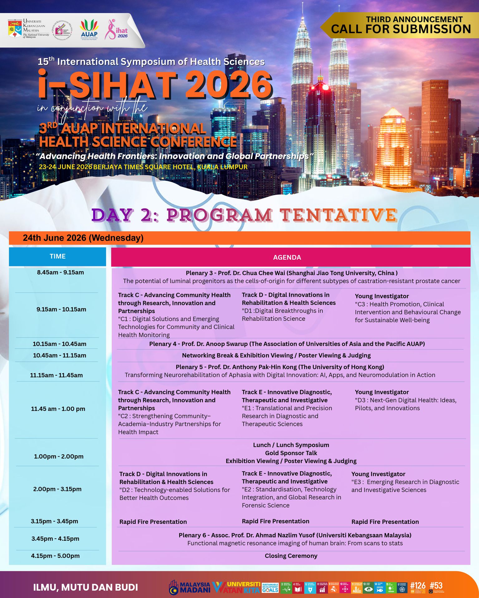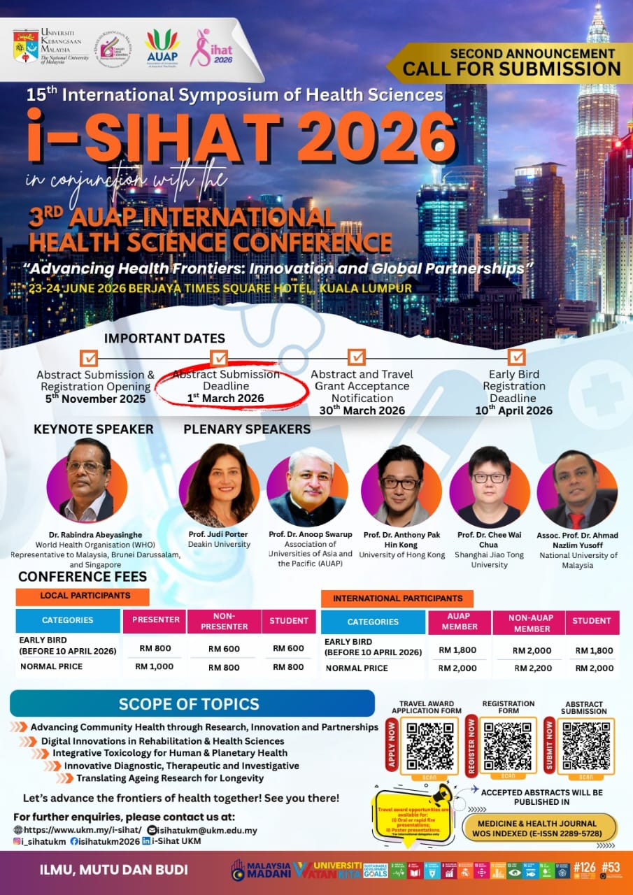 The Association of Universities of Asia and the Pacific (AUAP) in cooperation with Universiti Kebansann, Kuala Lumpur, Malaysia will organize the 3rd AUAP International Health Science Conference 2026! In conjunction with the 15th International Symposium of Health Sciences (i-SIHAT 2026), under the theme: “Advancing Health Frontiers: Innovation and Global Partnerships.”